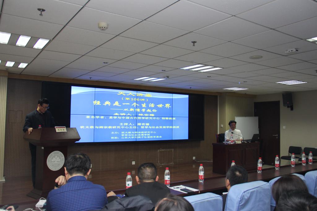 随后,林安梧教授阐释了本次讲座的中心内容——“生活世界”和“意义诠释”各自的意义及二者的密切关系。他认为,经典是一个生活世界,而不只是材料。让经典表达自己,需要从存在的觉知到概念的反思到理论的建构。具体来说,“生活世界”是指我们的生活构成的世界,“生”是通贯于天地人我万有一切所成之总体性的创造性根源,是从可能性之中生发出来的。比如,一根小草从泥土中生长出来。“活”是以其身体、心灵通而为一展开的实存活动。“世”是绵延不息的时间历程,“界”是广袤有边的空间区隔。首先,“生活”是创造性根源,落实于人这样一个活生生的实存而有,以其身体、心灵通而为一,因之而展开的实存活动。可以看到,林安梧教授在一个源头的意义上而不只是平铺的意义上言说生活,表明生活世界隐含着最终的“道”,“道”既是宇宙创造之动源,又是落实到人跟人之间的一种真实关怀。不是一个定义,也不是一个理论系统和知识系统。其次,“世界”是由此绵延不息的时间历程与广袤有边的空间区隔,时间历程本无区隔,空间之广袤亦本为无边,但经由人的智慧和知识而有区隔,亦因之而能交错。林安梧教授强调,生活之为生活是因为人之生而活,世界之为世界亦因人的参与能得交错,生活世界是天地人三才,人参与于天地之间而开启了世界。所以,我们该重视的是生命的历程,而不是知识逻辑的空间定位。而“意义诠释”指的是吾人以其心意,追求意义,开放的言说,道亦因之而彰显。“意”表意向,是由纯粹意向而走向一及于物的意识状态。“义”是由意向之走向一及于物的状态,因之而生的意义理解。“诠”是言权,是由意向、意义而开启的言说、徵符。“释”是释放,是由总体之创造性根源的道的彰显与释放。用一句话概括,“意义”就是潜意识到意识到意识之所及。