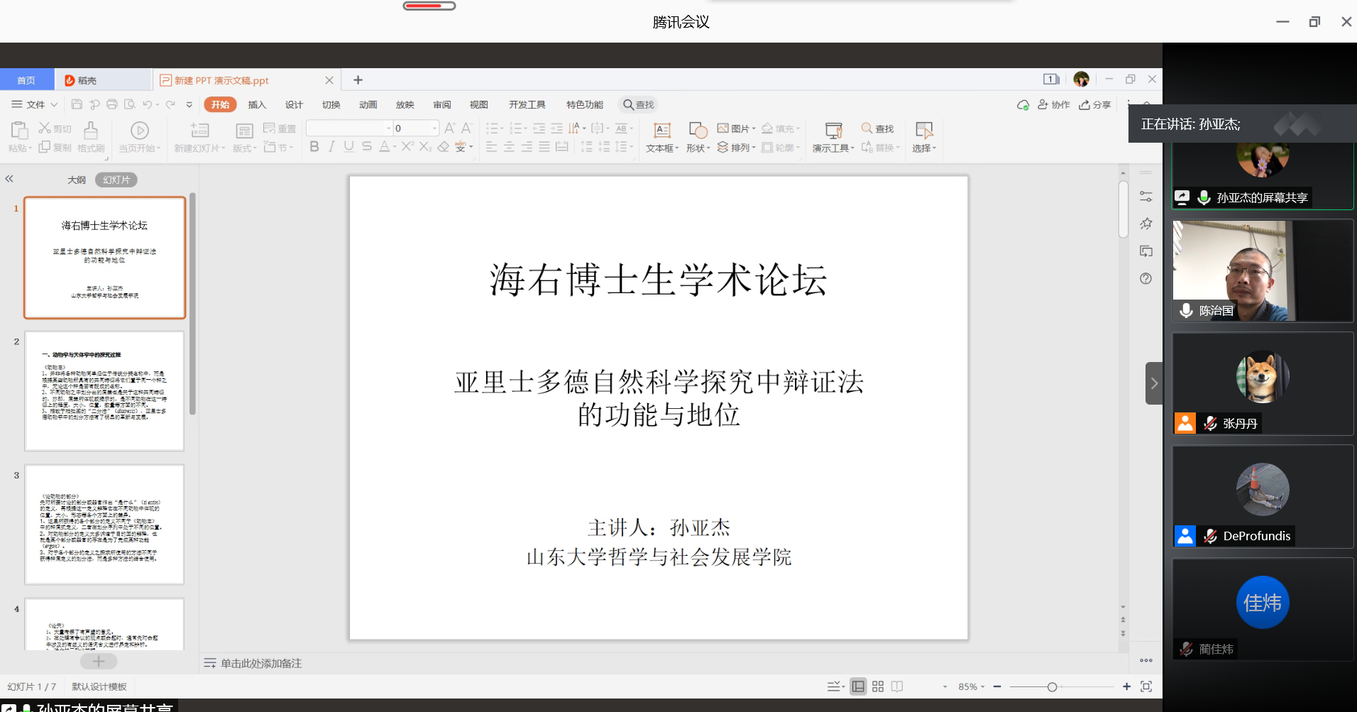 承办。论坛邀请2017级外国哲学专业博士研究生孙亚杰作了题为“亚里士多德自然科学探究中辩证法的功能与地位”的报告,H视频