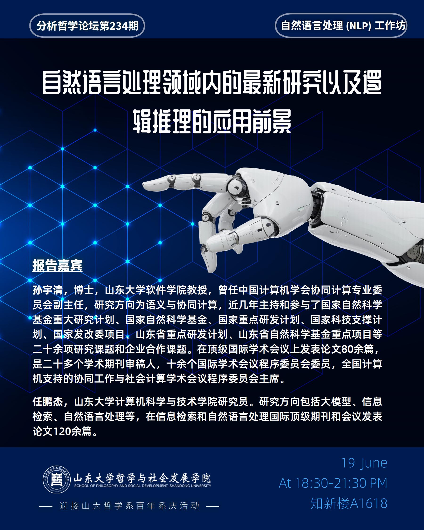 论坛主题为自然语言处理(NLP)小型工作坊,介绍自然语言处理领域内的最新研究以及逻辑推理的应用前景。会议将围绕自然语言处理展开讨论。