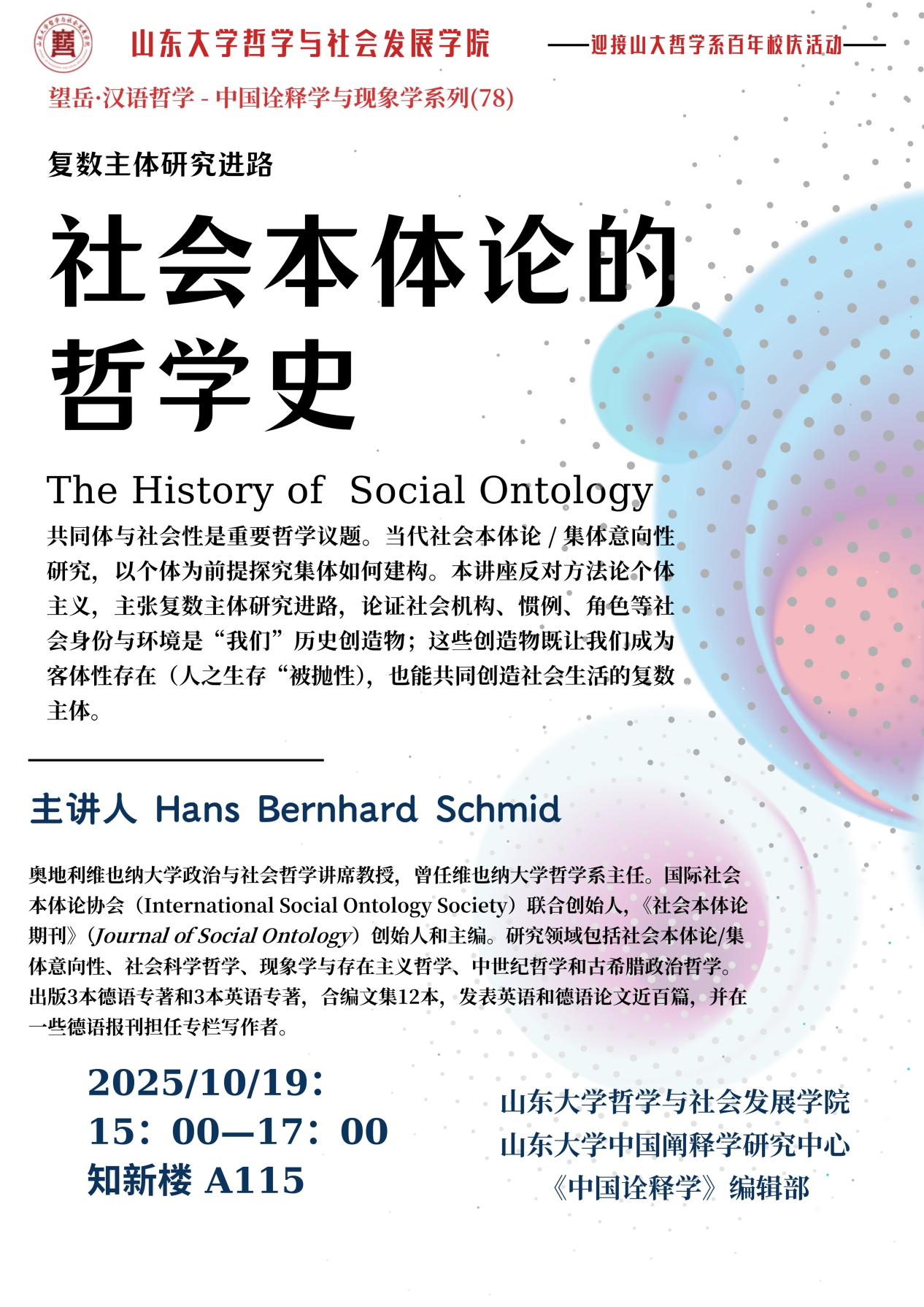Hans Bernhard Schmid,奥地利维也纳大学政治与社会哲学讲席教授1970年生于瑞士,在巴塞尔大学接受社会学、哲学与中世纪历史的高等教育并于1999年获得巴塞尔大学哲学博士。曾在纽约新学校、圣加仑、巴塞尔和弗赖堡等大学担任访问教授,2006年至2011年担任巴塞尔大学SNRF哲学研究教授,2011年起担任维也纳大学政治与社会哲学讲席教授,曾任维也纳大学哲学系主任。国际社会本体论协会(International Social Ontology Society)联合创始人,社会本体论期刊(Journal of Social Ontology)创始人和主编。