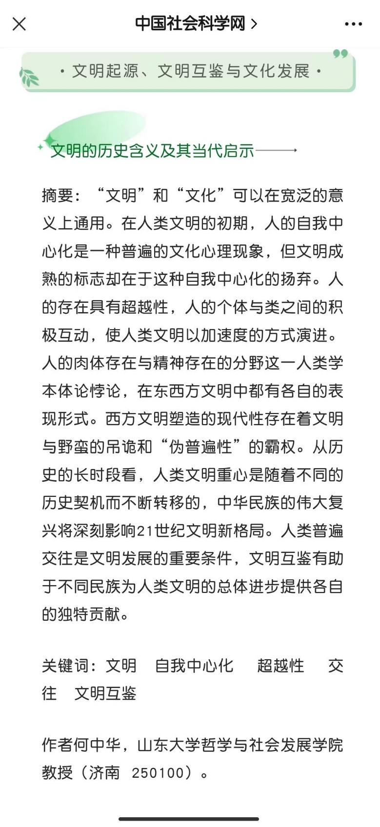 何中华教授在《中国社会科学》2023年第6期发表高水平论文《文明的历史含义及其当代启示》。