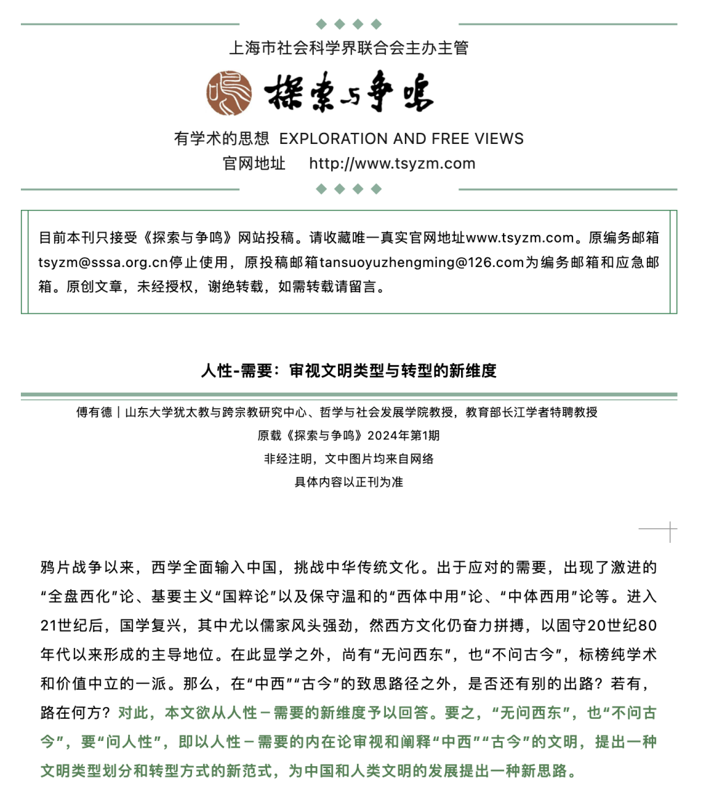 傅有德教授在《探索与争鸣》2024年第1期发表高质量论文《人性-需要:审视文明类型与转型的新维度》。