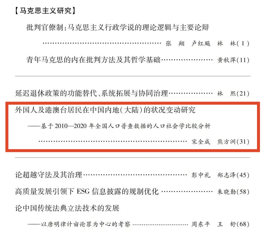 宋全成教授与其硕士研究生熊方洲共同在《厦门大学学报(哲学社会科学版)》 2024年第3期上发表了题为《外国人及港澳台居民在中国内地(大陆)状况变动研究——基于2010—2020年全国人口普查数据的人口社会学比较分析》的高质量论文。