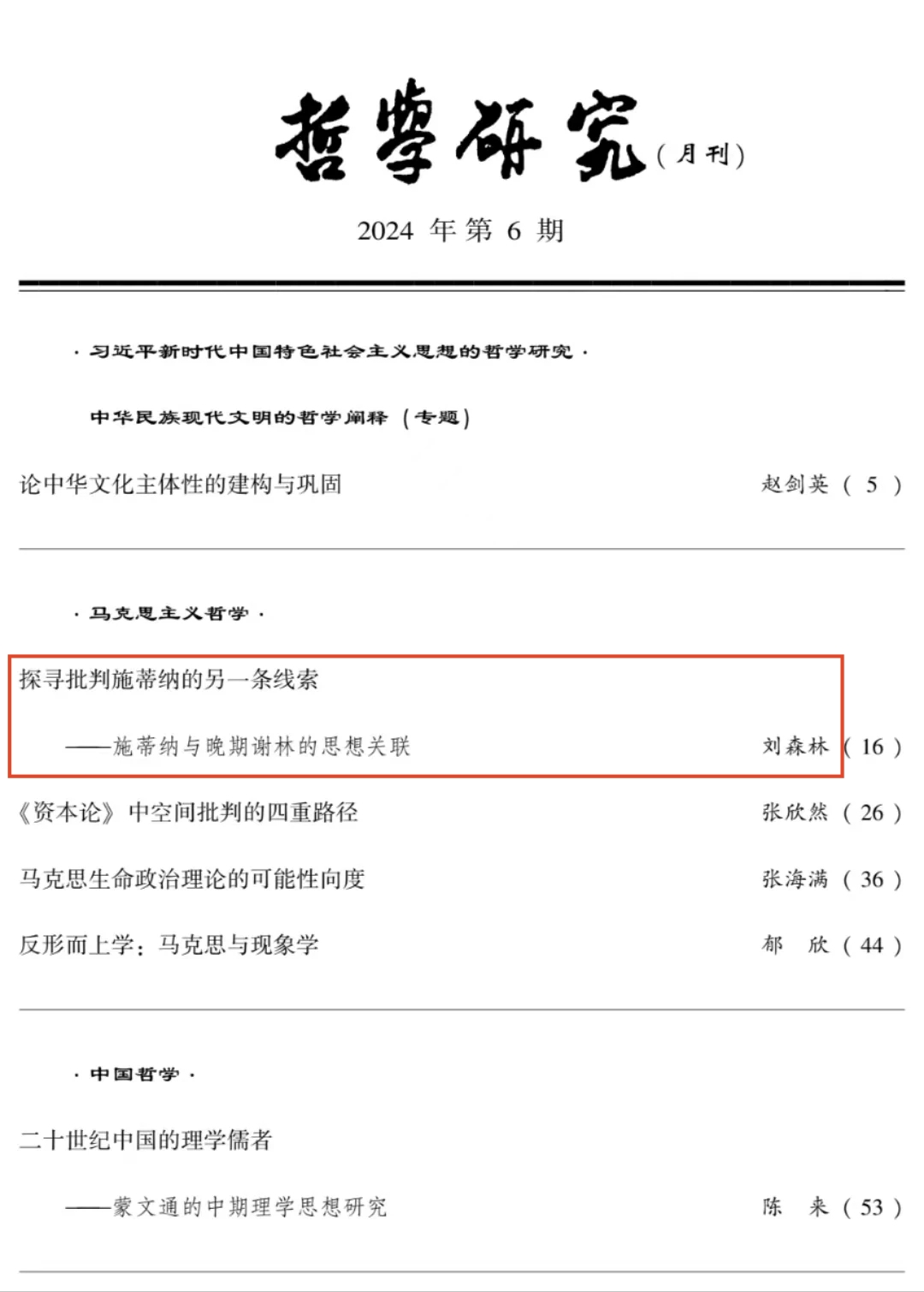 刘森林教授在《哲学研究》2024年第6期上发表了题为《探寻批判施蒂纳的另一条线索——施蒂纳与晚期谢林的思想关联》的高质量论文。