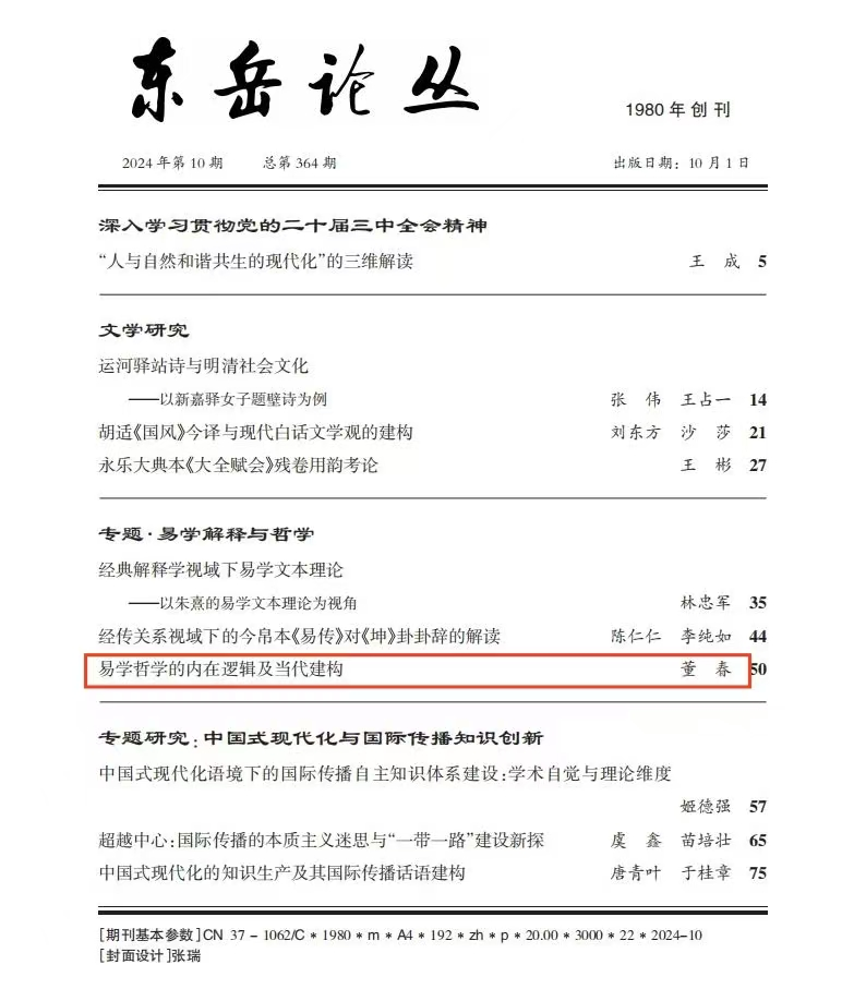 易学与中国古代哲学研究中心董春副教授在《东岳论丛》2024年第10期上发表了题为《易学哲学的内在逻辑及当代建构》的高质量论文。