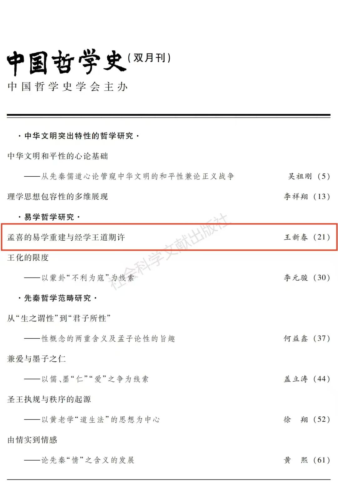 王新春教授在《中国哲学史》2024年第6期上发表了题为《孟喜的易学重建与经学王道期许》的高质量论文。