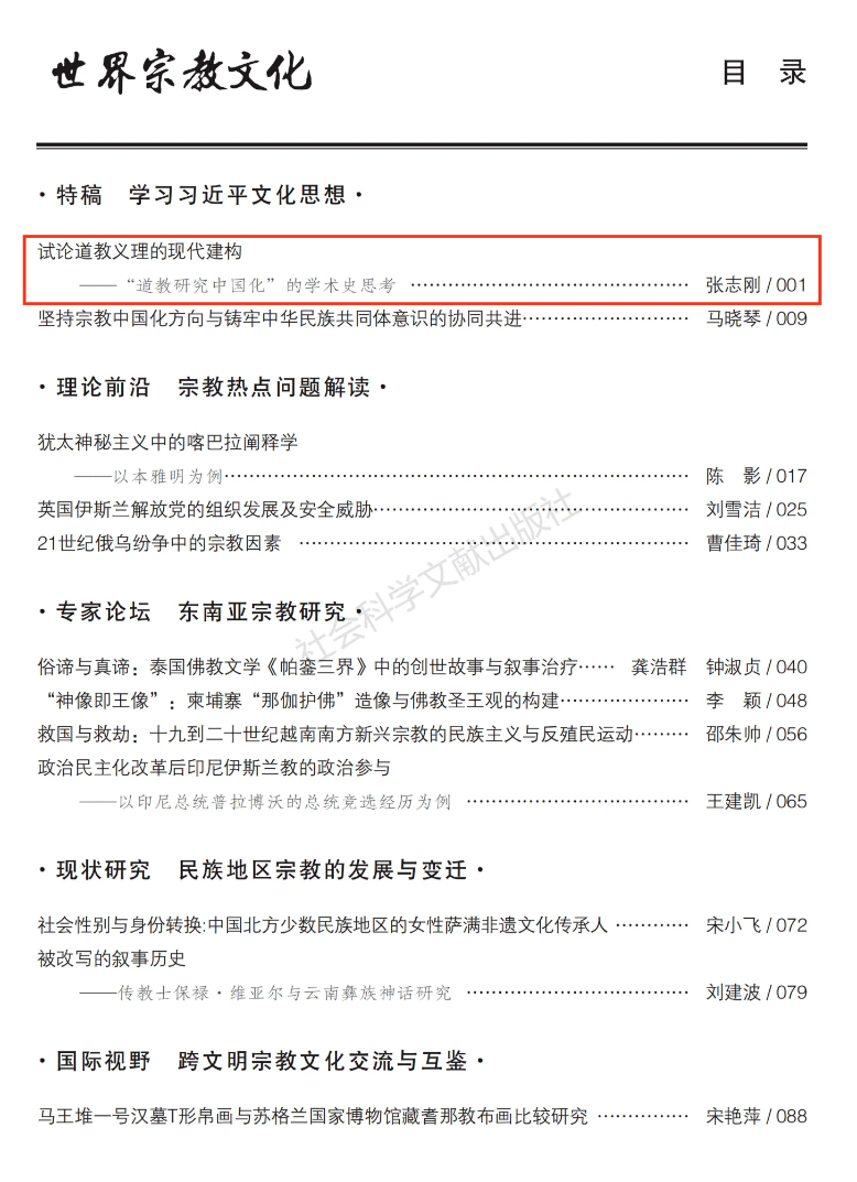 暨犹太教与跨宗教研究中心张志刚教授在《世界宗教文化》2025年第1期上发表了题为《试论道教义理的现代建构——“道教研究中国化”的学术史思考》的高质量论文。