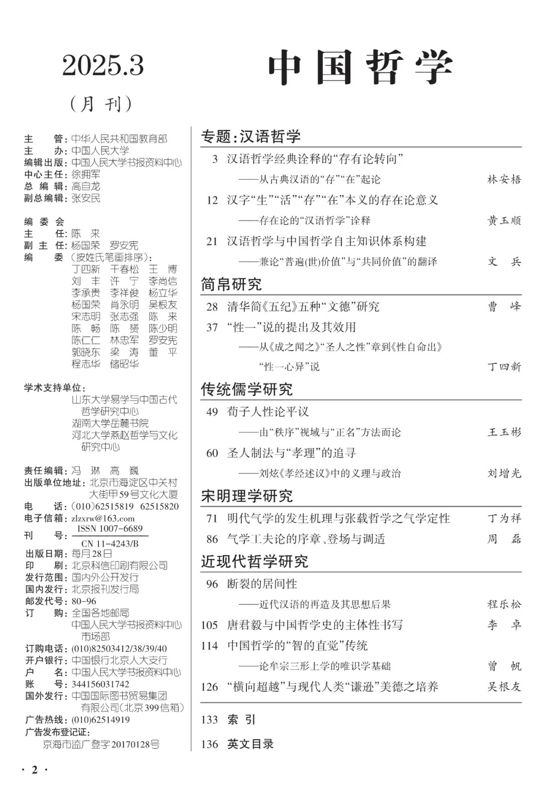 《中国哲学》为中国人民大学书报资料中心编辑出版刊物,精选中国古代哲学及史料学、中国哲学的特点及方法论、中国哲学的现代转化及中西哲学的比较等最新研究成果,旨在探讨先秦诸子学、两汉经学、魏晋玄学、宋明理学、明清实学、中西会通的近现代哲学,辨析儒释道三家在中国互相斗争及融合发展的历史,反映新世纪中国哲学的发展动向以及与中国社会现代化的关系,设有综论、易学研究、传统儒学研究、诸子学研究、宋明理学研究、道家思想研究、现代中国哲学研究等亮点栏目。
