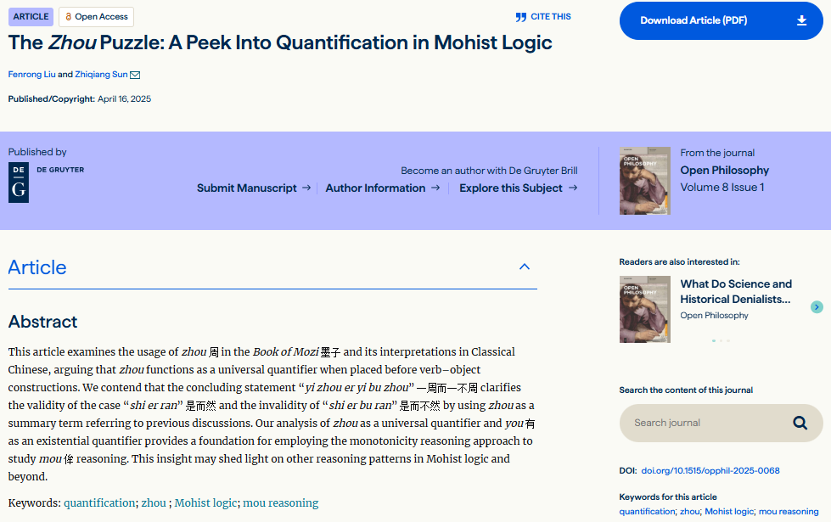 孙志强助理研究员、清华大学人文学院刘奋荣教授共同在英文期刊 Open Philosophy 上发表了题为The Zhou Puzzle: A Peek Into Quantification in Mohist Logic(《“周”谜题:墨家逻辑量化现象探析》)的高质量论文。