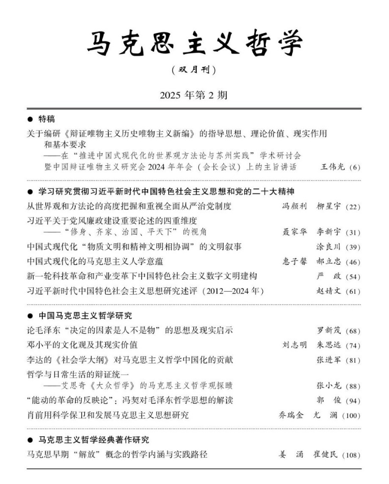 姜涌教授与其博士研究生崔健民共同在《马克思主义哲学》2025年第2期上发表了题为《马克思早期“解放”概念的哲学内涵与实践路径》的高质量论文。