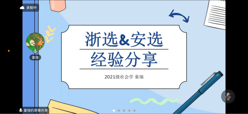 1月25日晚7点至9点,一场干货满满的“基层选调,服务民生”经验分享会准时举行。此次分享会邀请到了2021级本科生童瑞、侯嘉诚和2022级研究生牟晓雨,他们结合自身丰富的阅历和经验,为怀揣梦想的同学们带来了一场知识盛宴。