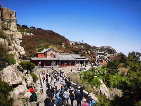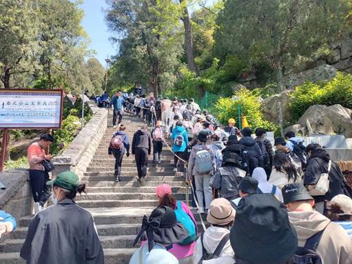 5月7日一早,哲社师生赶赴泰山,按照规定的路线和组别,结伴而行。路途中,哲社师生驻足欣赏历代名人遗留的摩崖石刻与碑碣,了解泰山石敢当、五大夫松等历史故事,体悟其中蕴含的多重文化内涵与精神风貌。泰山摩崖石刻与碑碣可以追溯至秦汉时期,历史悠久,延续不断,大多为政治文化名人所题,书法精美,具有珍贵的艺术价值。同时,这些流传千年之久的摩崖石刻与碑碣,或富于高雅意趣,或气势恢弘、体量巨大,为壮丽的自然风光增加了丰厚的人文底蕴。哲社师生将所学知识与眼前实景相结合,接受泰山绵延千年而未绝的历史文化洗礼,充分体会到了中华优秀传统文化的博大精深。