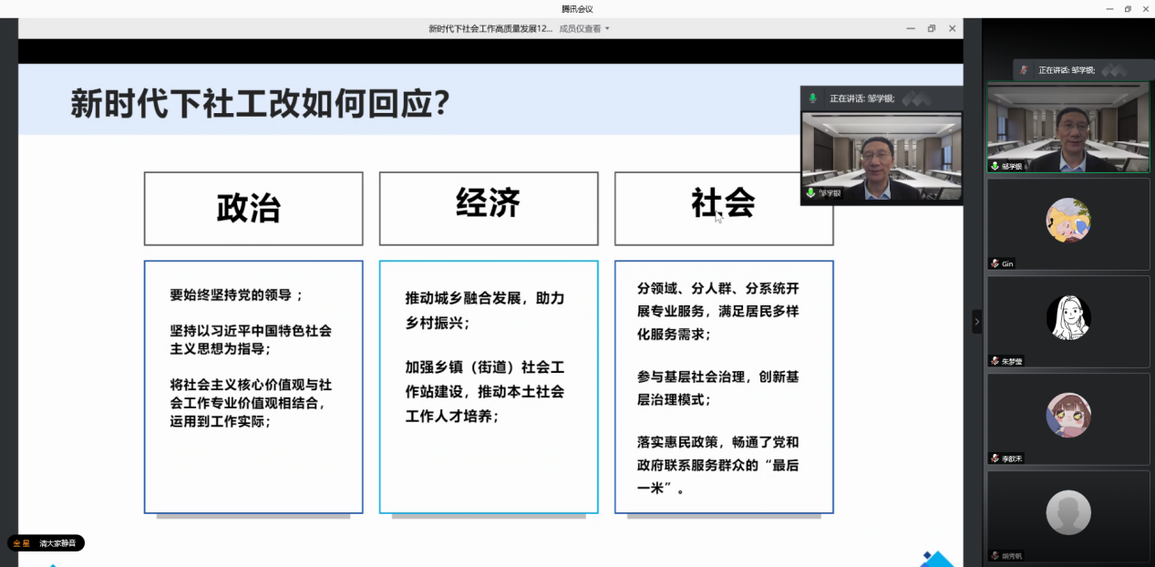 邹学银教授从三个部分介绍了新时代下的社会工作高质量发展内容,首先,从政治、经济、社会三个方面论述了社会工作所处的新时代背景,并针对新时代下社会工作如何回应相应问题做出了解答,他认为,政治上要坚持党的政策方针,站在新的历史方位上推动社会工作的发展,经济上要关注区域发展和城乡发展不平衡问题,社会上要重视社会问题的复杂性和人民需求的多样性问题,并进一步提出要推动基层社会治理现代化,发挥社会工作在基层社区治理中的专业优势,探索“五社联动”机制。随后,以实地举例的方式向大家介绍了各地样本和参考,例如广东省的“双百计划”、湖南省的“禾计划”、浙江省加快推进社会工作站建设、湖北省的“五社一心”心理疏导社会工作服务项目等;第二部分,邹秘书长带领大家一起回顾了我国社会工作发展概况,我国社会工作已从民政工作领域逐步扩展到青少年事务、老年服务、妇女服务、残障帮扶、社会救助、救灾应急、医疗服务、农村服务、社区矫正、职工帮扶、禁毒戒毒等多个领域;第三部分,邹秘书长就社会工作高质量发展提出了整体思路和具体路径。整体思路包括扩大规模、调整结构、提高质量、提升效能和完善制度,具体路径有六个,一是强调专业人才,二是重点做好高级社会工作师评价工作,三是加快专业人才培养,四是优化专业人才结构,五是规范社会工作继续教育,六是提高学术期刊与高学术论文数量和质量。