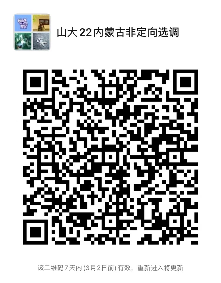 另外,请报名的同学扫码入群,二维码失效后可通过电子邮箱“[email protected]”联系工作人员,备注“姓名-学院-内蒙古非定向选调”及时入群。