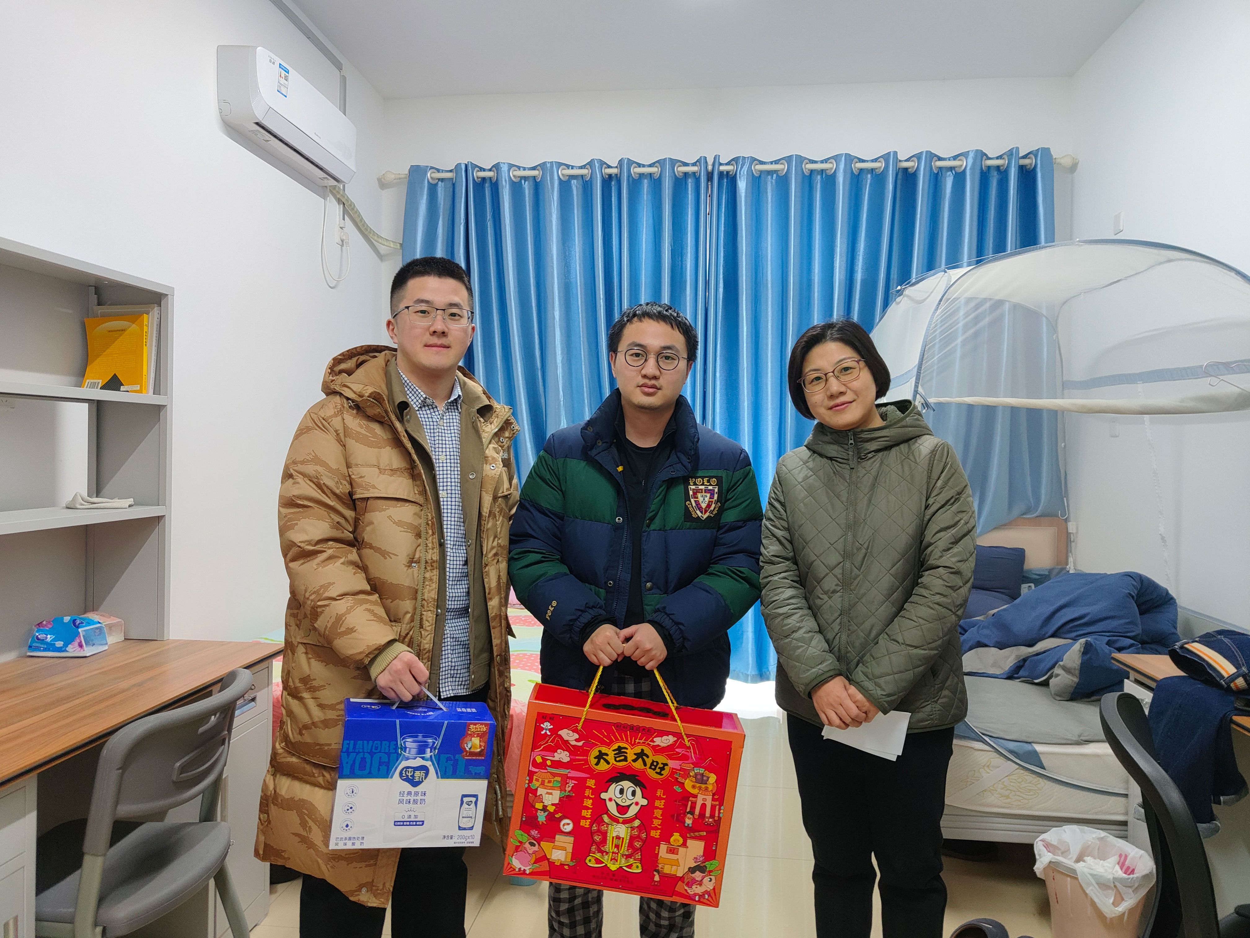 在走访慰问过程中,院领导与同学们进行了亲切交流,了解同学们科研学习方面的进展,听同学们分享寒假在校生活的点滴,叮嘱安全注意事项和保持劳逸结合,将装满祝福的节日礼包送到同学手中。留校同学对老师们的亲切关怀表示感谢,与老师们互道新年快乐。