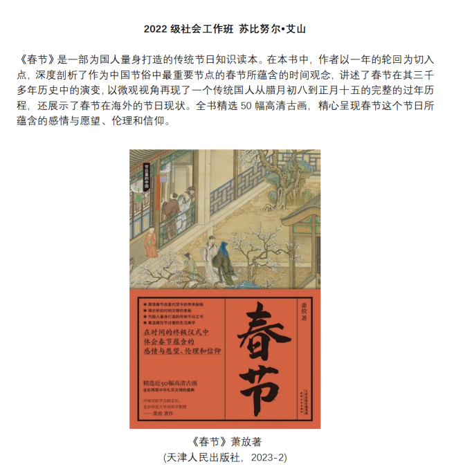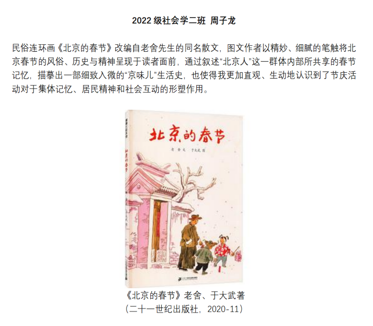 2022级本科生周子龙同学表示:“阅以启智,读以润心,走进书籍里,我们跨越时间、跨越地点,在时间长河里寻找年的模样,在五湖四海中品味不同年味。本次推书活动让我有机会入了解节日与民俗,也让我有机会把好书推荐给更多同学。”