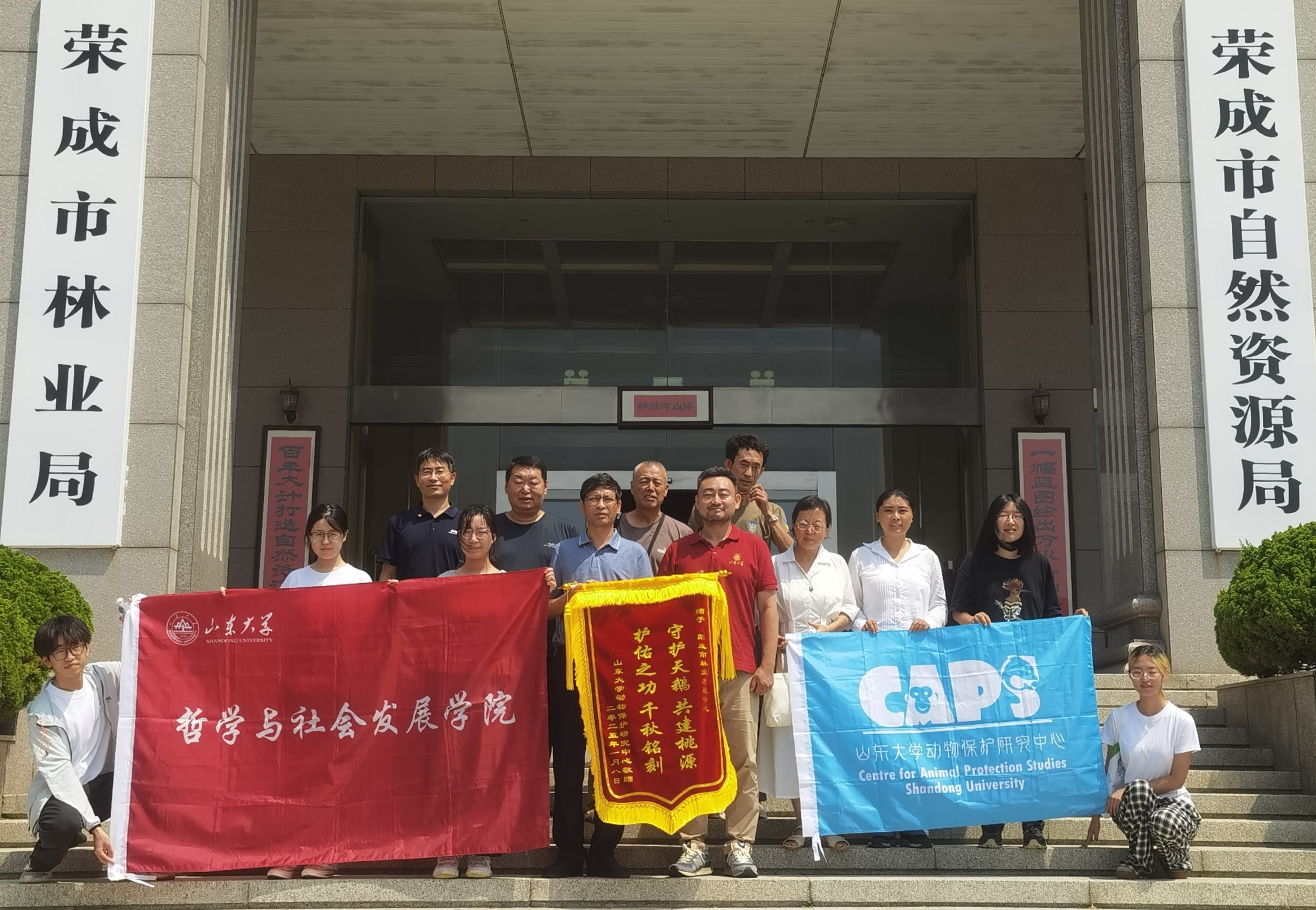 概况,并阐述大天鹅保护项目“多方合作、跨学科融合、国内外专家团队”等优势。郭鹏介绍了动物保护研究中心概况。双方围绕当地生态保护、校地合作形式、科研活动开展路径等议题展开交流。吴童立为荣成市林业发展中心赠送锦旗。