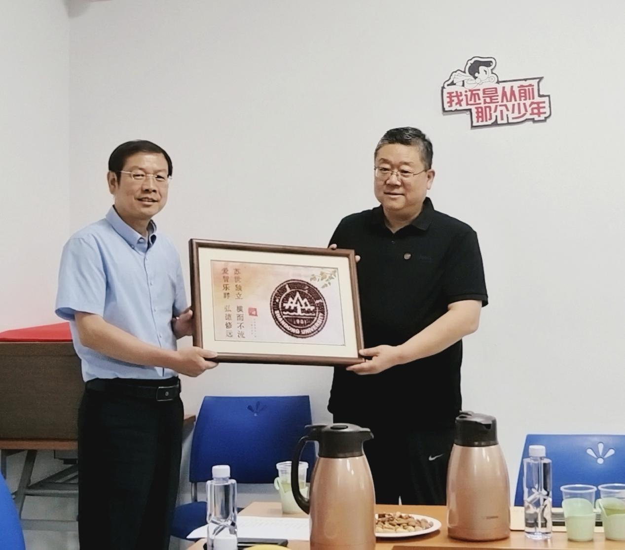 为表达对母校的感恩之情,团支部书记刘军向学院赠送了校友们精心准备的纪念品——一幅精心制作而成的“校徽院训种子粘画”,寓意"根系山大,叶茂四方"。