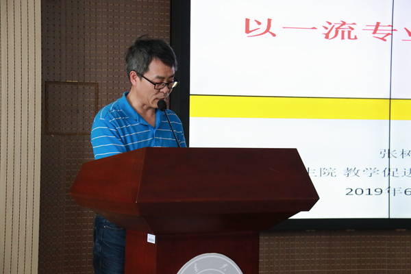 随后,张树永以 “以一流专业建设为契机,全面提升人才培养能力和水平”为题作报告,分别从建设一流本科的形势与任务,哲学、社会学建设一流本科的形势,一流专业建设与三级认证与当前迫切需要开展的工作这四项内容阐述了学院本科建设的迫切性与重要性。张树永在报告中详细说明了一流专业建设与三级认证的培养目标、毕业要求、课程体系、师资队伍、条件支持、质量保障、学生发展这七项三级标准。指出学院本科教学达到一流专业建设与完成三级认证要明确培养目标、提高学生毕业要求、完善课程体系建设、增强师资力量、加强教学条件支持、完善教学质量保障体系、注重学生全方位发展。最后,张树永提出要进一步学习领会一流专业建设的本质,实现专业建设以学生为中心,以产出为导向与质量持续的改进;进一步修订专业人才培养方案;全面制订和落实质量标准;改革教学理念和方法;大力改革考试制度;建立系统的质量保障机制。