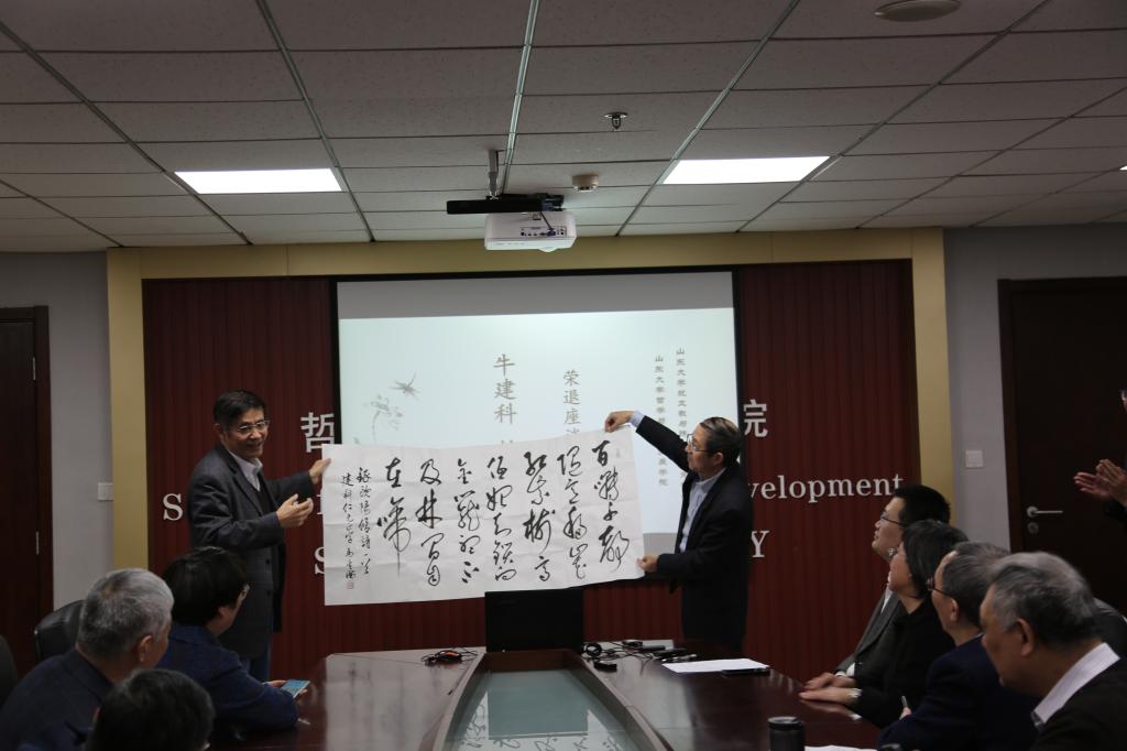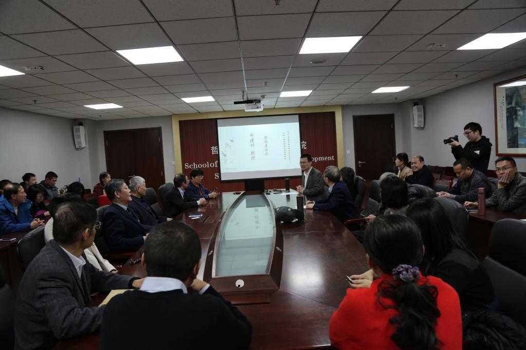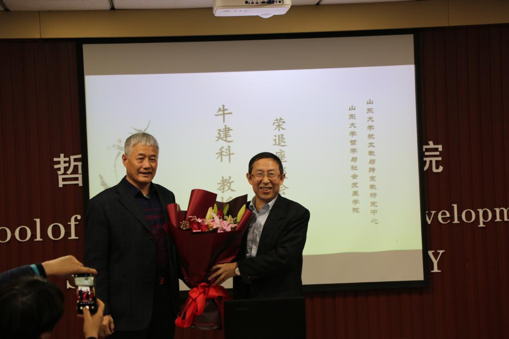 座谈会中,郑倩对牛建科教授多年来为学院学术研究及人才培养所作出的贡献表示衷心的感谢。他表示,牛建科教授在学院多年,一直以敬业的学术精神与积极乐观的生活态度影响着身边的每一位同事及学生,是见证了学院发展,并作出突出贡献的教师。傅有德教授对牛建科教授的荣退表示了衷心的祝愿。荣退是职业工作生涯的结束,但更是一段新生活的开始,在这段期间可以有更多的时间享受生活。傅有德教授回顾了与牛建科教授共同学习、共同研究以及共同工作的经历,并对牛建科教授在学术上的成就进行了简单总结。无论是学术工作,还是犹太教与跨宗教研究中心的管理工作,牛建科教授都能够有条不紊、踏踏实实地完成。同时,他代表多年来与其共事的各位同事,祝愿牛建科教授能够保持乐观积极的心态,快乐享受退休生活。刘岳兵教授代表同行学者发言。他表示,二人作为同领域的研究学者,牛建科教授一直在学术方面对他提供了很多的建议与帮助,是学术界公认的具备良好学术素养与研究能力的优秀学者。未来,还希望牛建科教授在享受退休生活的同时,能继续为宗教学研究提供指导。随后,与会的学院同事、同行学者及学生代表一一发言,分享了与牛建科教授共事的经历与感悟,并送上了真挚的祝福。