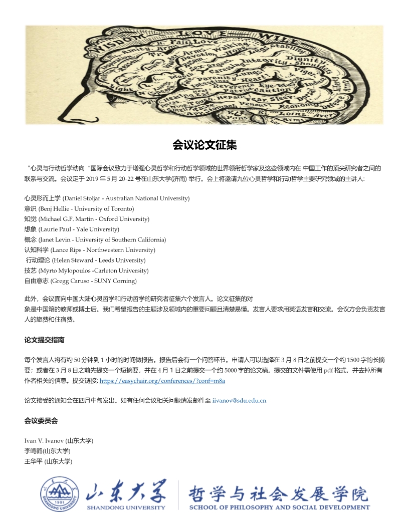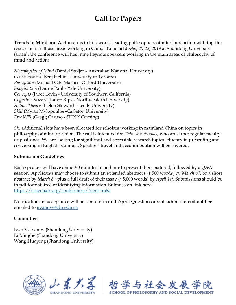 H视频 将于2019年5月20-22日举行”心灵与行动哲学动向“国际会议,在此征集六个会议报告人。此次会议旨在汇集心灵哲学与行动哲学主要领域的海外及国内一流学者的研究成果。除了国内的六个报告,会议还将有9名世界领衔学者的主题报告。诚邀大家申请参会。 会议详情://www.easychair.org/cfp/M8A 线上提交://easychair.org/conferences/?conf=m8a