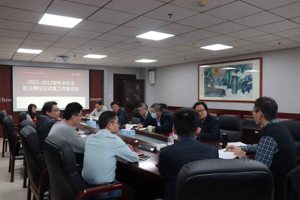 于知新楼A1618举行2021-2022学年本科生班主任聘任仪式暨工作座谈会。院长刘森林、党委书记郑倩、副院长程胜利及全体本科生班主任、辅导员参加此次座谈会。座谈会由党委副书记李永卫主持。