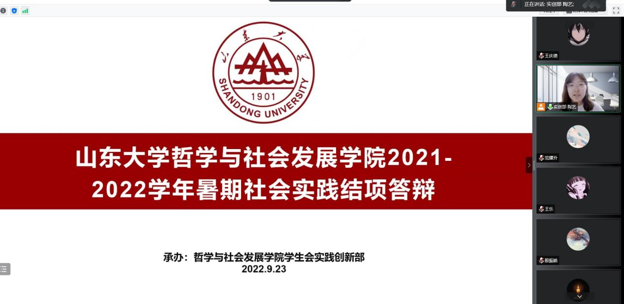 本次结项答辩集中展现了哲社学子在2021-2022学年暑期社会实践中的昂扬风貌,总结实践取得的优秀成果与经验,体现山大学子学而致知,行而致远,在社会实践中充分发挥专业优势,将理论与实践紧密结合,以实际行动迎接党的二十大胜利召开,献礼建团百年。