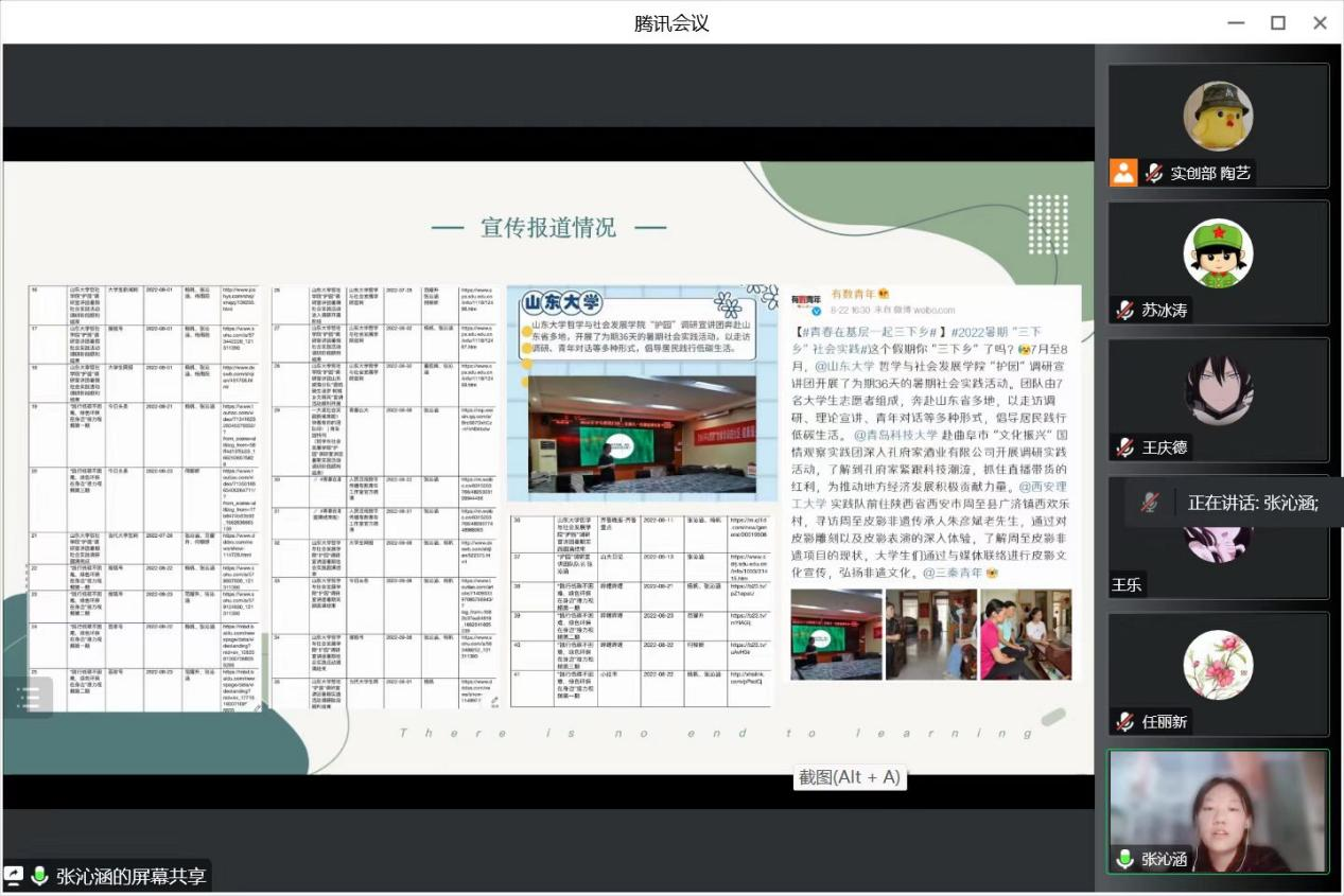 2021-2022学年暑期社会实践结项答辩会通过腾讯会议线上举行,社会工作系教授任丽新老师、社会学系副教授苏冰涛老师、辅导员封莹老师、研究生代表张循铖、王乐担任本次答辩会评委并进行结项指导,各院级立项团队答辩代表参会。