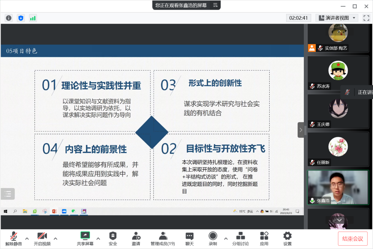 参与本次结项答辩的共有13支院级立项团队,各团队代表按照抽签顺序,依托演示文稿、结题报告、总结视频等形式全方面展现实践背景、实践目的、实践过程与实践成果,总结实践意义,分享感悟收获,展现哲社学子暑期社会实践的青春风采。