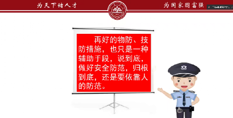 10月6日晚,学院举办了安全教育讲座,邀请学校党委保卫部杜春兴老师主讲。杜春兴从校园火灾预防、电动车安全、电信诈骗预防、网络安全、国家安全等方面为同学们科普了详尽的安全知识,并强调了学校的校园安全政策以及注意事项,为同学们构建了物防、技防、人防三位一体的校园安全防范体系。