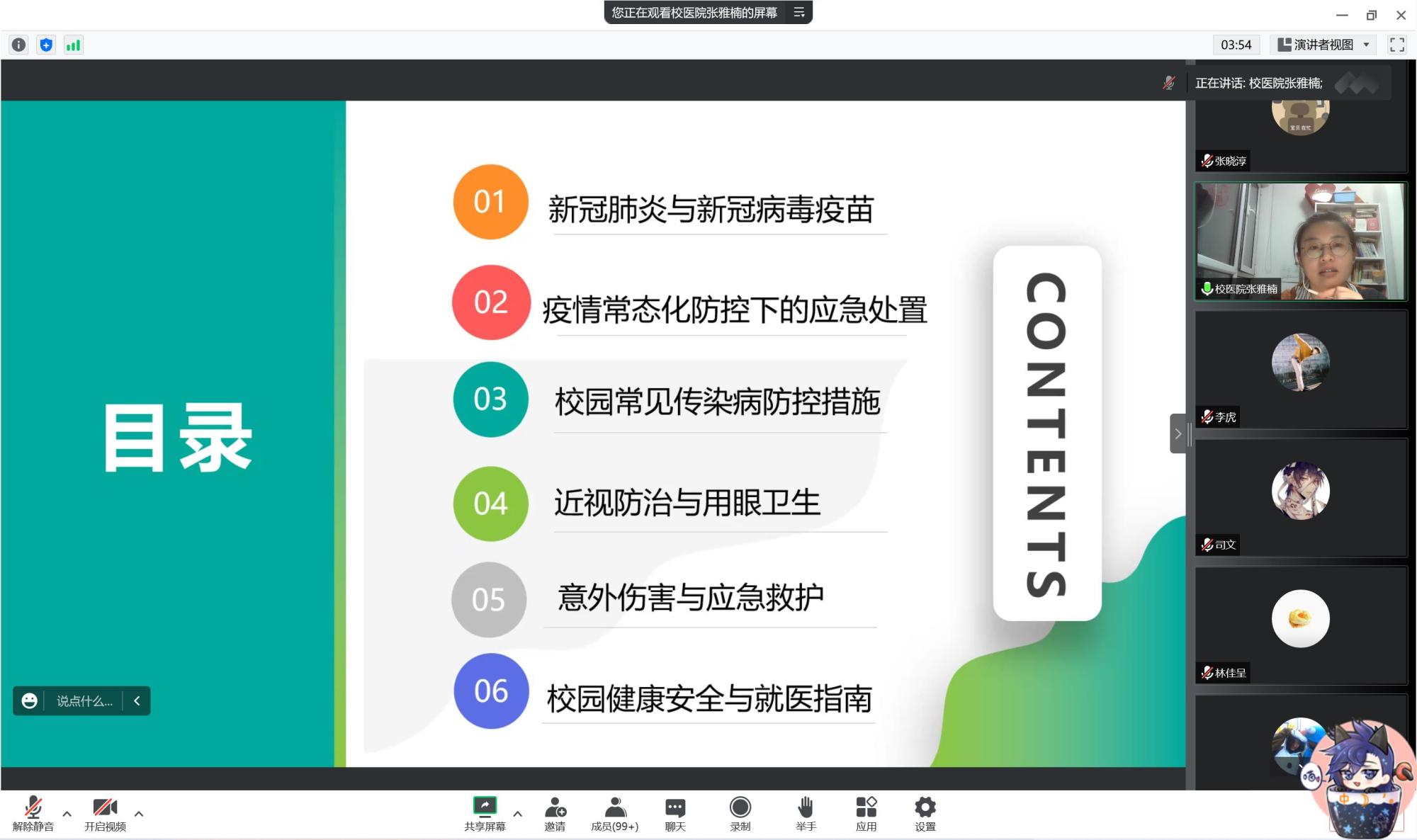9月25学院举办了卫生健康讲座,邀请到校医院工作人员张雅楠老师主讲。张雅楠向同学们介绍了疫情防控、校园常见传染病防控、近视防控、意外伤害救护、校园就医等方面的卫生健康知识,提高同学们的卫生健康意识。