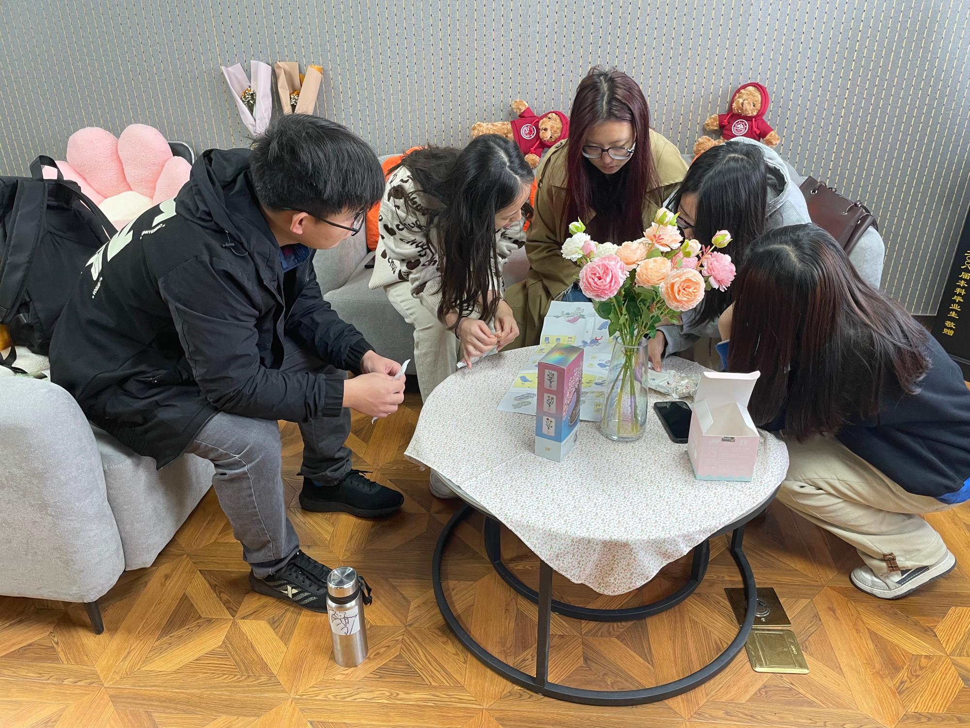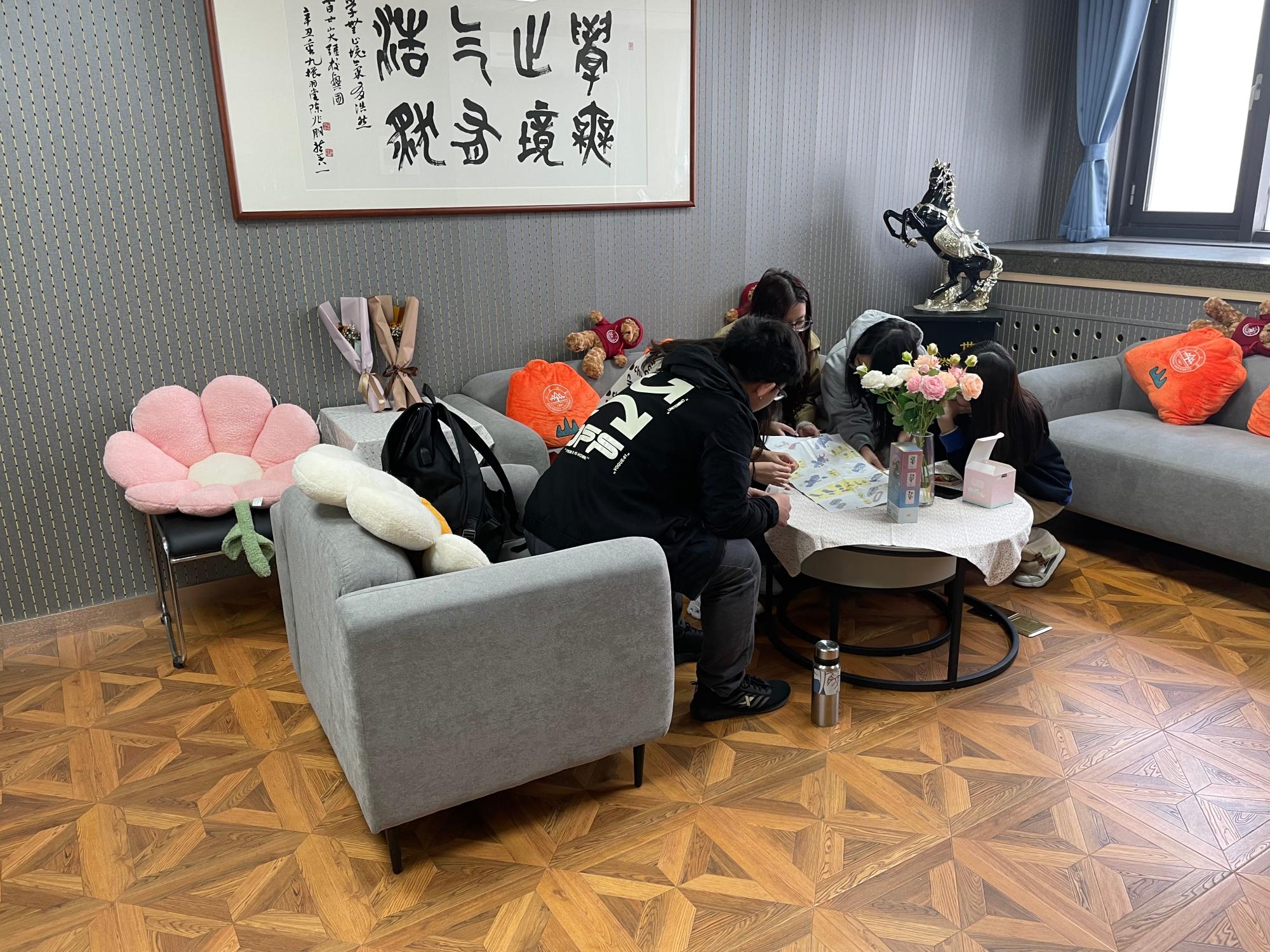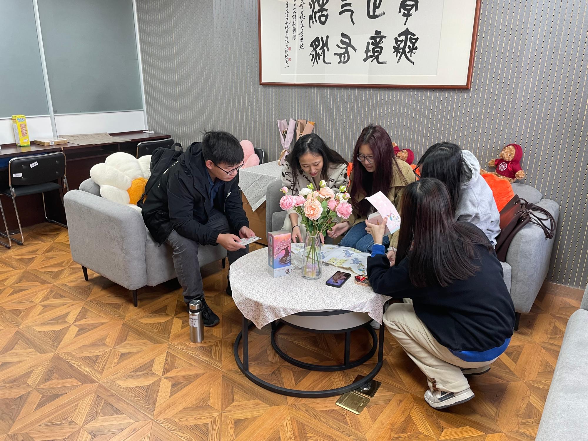2021级宗教学班全体同学在学院二级心理辅导站“听心小筑”进行拼插积木的活动。