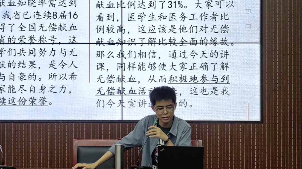 宣讲会开始,陈劲骁以典型事例说明当前我国血液供应仍处于紧平衡状态,志愿献血队伍仍需更多人的参与。他指出,献血不仅可以为他人的健康保驾护航,还有利于捐献者自身的身体健康。