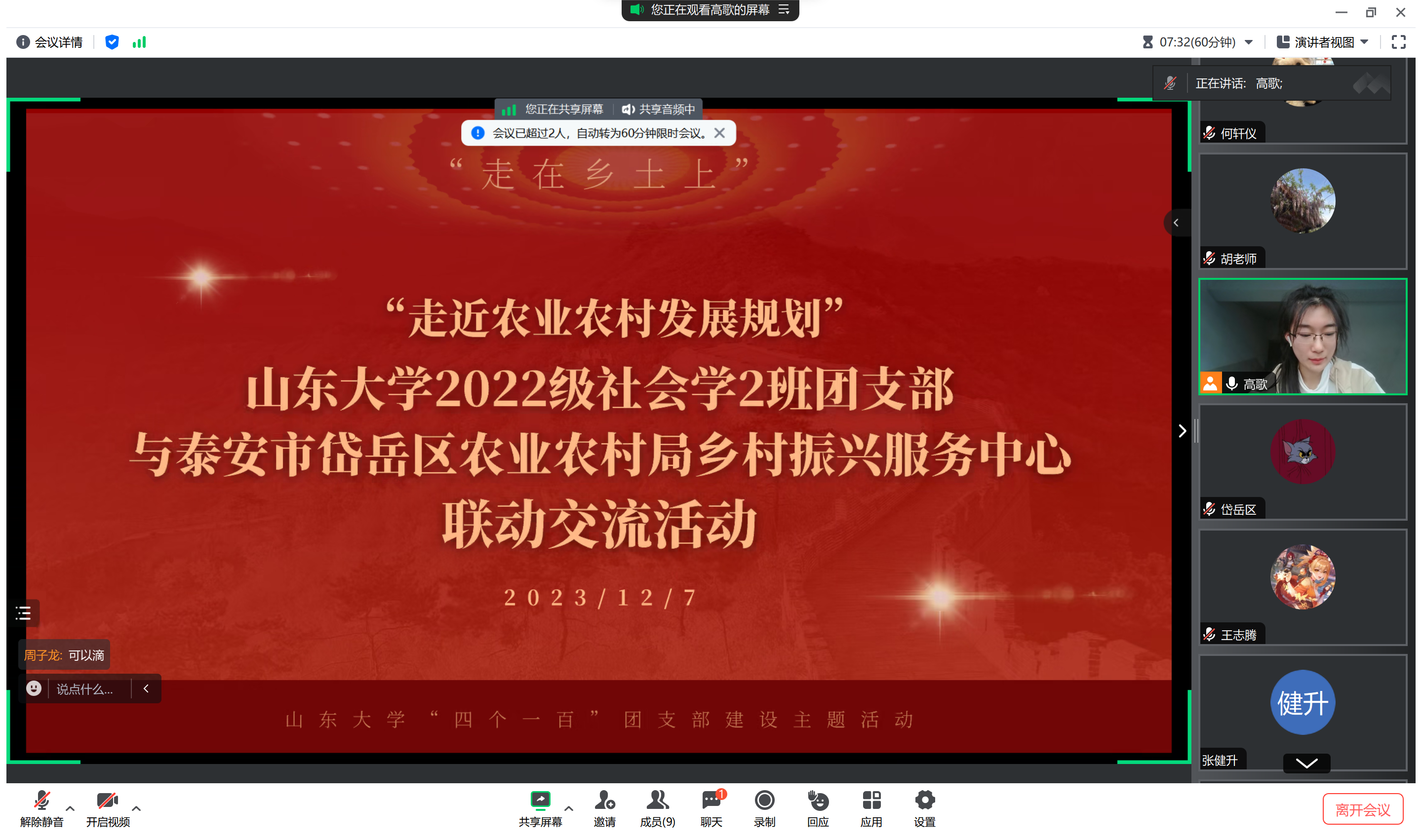 2022级本科社会学2班团支部于2023年12月7日开展了“四个一百”系列第一弹:“与泰安市岱岳区农业农村局的联动交流”主题团日活动。班内15名团员和3位群众参加了该活动,由该班团支部书记高歌主持。