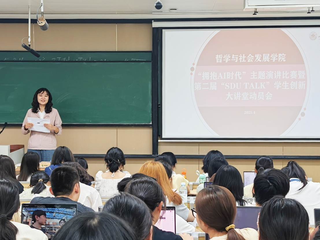 举办“‘拥抱AI时代'主题演讲比赛暨第二届‘SDU TALK'学生创新大讲堂"动员会。学院团委书记、2024级本科生辅导员班梦姣主持会议,2024级全体本科生参加会议。