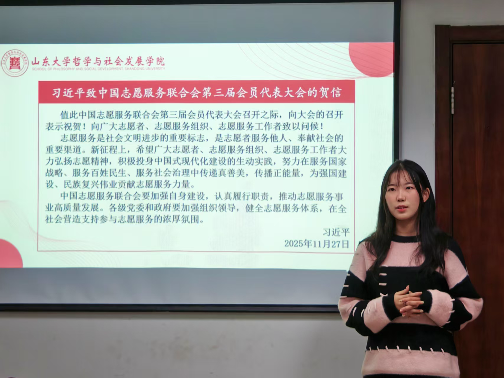 随后,哲社青志协负责人王思淇将团课学习的理论高度与高校青年的实践深度深度结合,分享对学院志愿工作的思考与规划。她指出,哲社学子应依托专业优势,锚定贺信精神方向,在乡村振兴、社区治理、生态建设等领域创新专业化志愿服务项目,以高素质志愿力量为社会文明进步注入新动能。