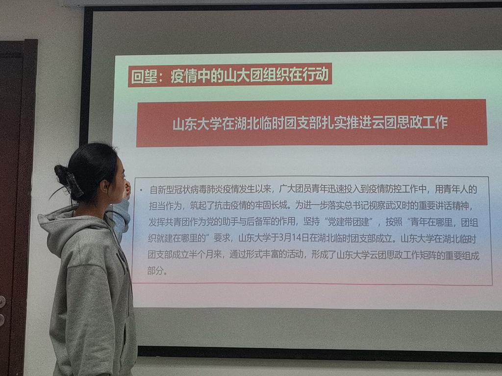 班会结束后,团支书屈雅楠主持团会。在会上,她声情并茂地讲解着共青团组织在抗疫过程中发挥的巨大作用,并回望了H视频