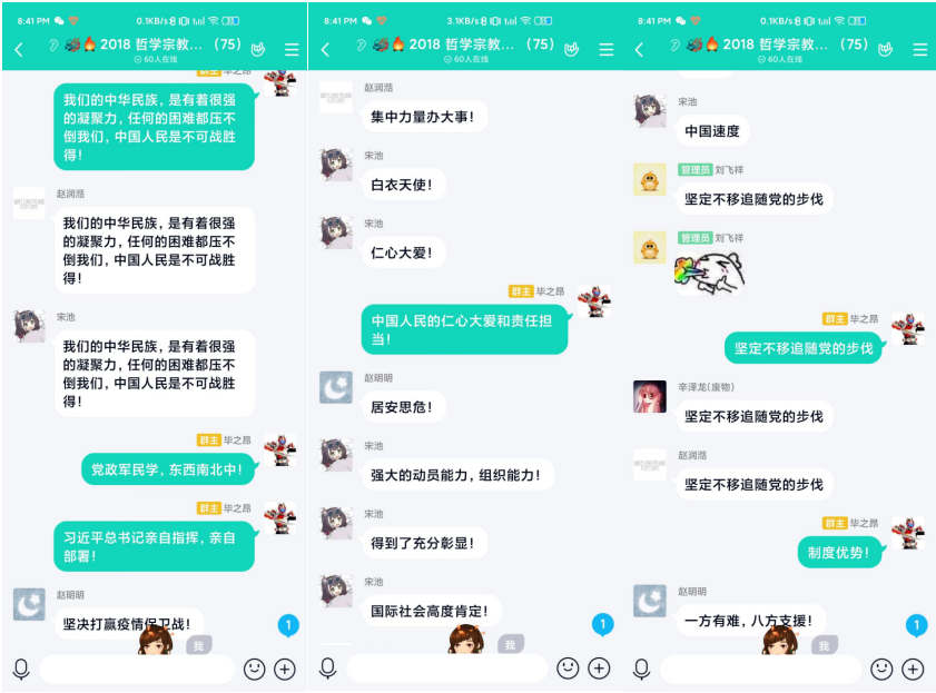 2018级哲学班的同学们:所有的同学都坚信,在以习近平同志为核心的党中央的正确领导下,打赢这场疫情防控的人民战争,打赢全球防疫总体战,国家保卫战,疫情阻击战。作为当代青年大学生的我们,正是勇于担当责任,承担使命的时候,在党的带领下,我们必将迎来美好的春天,必将迎来富强民主文明和谐的强国梦复兴梦!