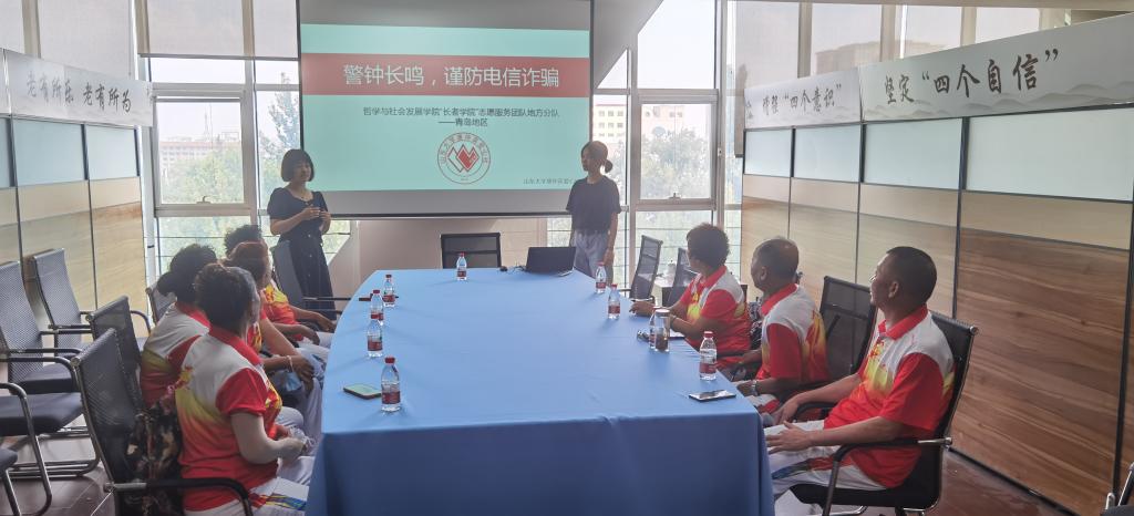 在了解到老人们对智能手机使用已经掌握较为全面的情况下,张煜、黄宇涵于8月28日上午赴山东省青岛市城阳区老年大学开展“警钟长鸣,谨防电信诈骗”的宣讲活动。本次课堂从电信诈骗的常见形式、如何预防电信诈骗、相关补救措施三方面展开,结合老年人的生活实际,通过举例,以真实情景讲述常见诈骗手段以及预防措施,为老年人普及了相关知识,提高了预防电信诈骗的思想意识。课堂上老人们认真聆听,互动环节积极提问。活动结束后,老人们对本次课堂表示了赞赏与肯定。