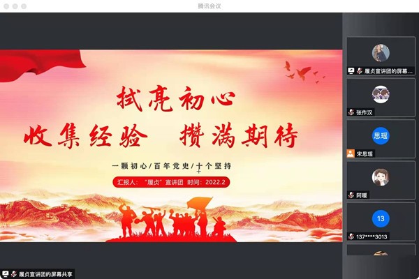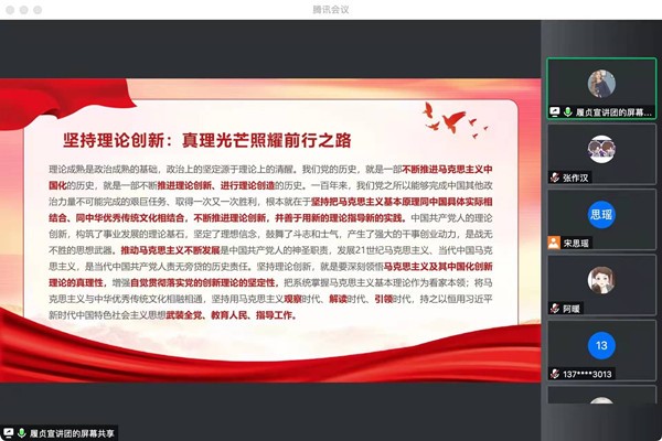 “履贞”宣讲团青岛分站——城阳区老年大学宣讲活动举行。本次宣讲由“履贞”宣讲团张煜同学主讲,主要面向老年大学学生及有关政府工作人员,宣讲党的十九届六中全会精神。为响应当地疫情防控政策,宣讲于线上腾讯会议举行。