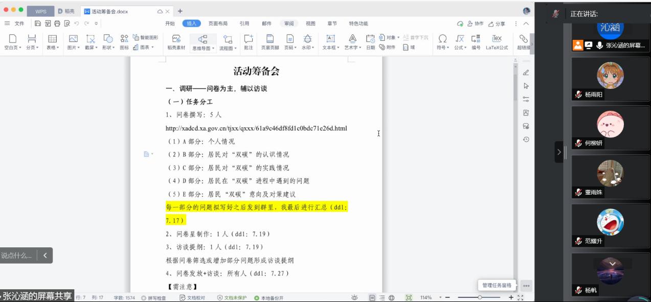 “护园”赴山东多地关于双碳背景下城镇居民低碳意识调研宣讲团在腾讯会议上召开暑期社会实践活动筹备会。队长张沁涵主持,来自哲学、社会学、新闻学专业的6名团队成员参与。