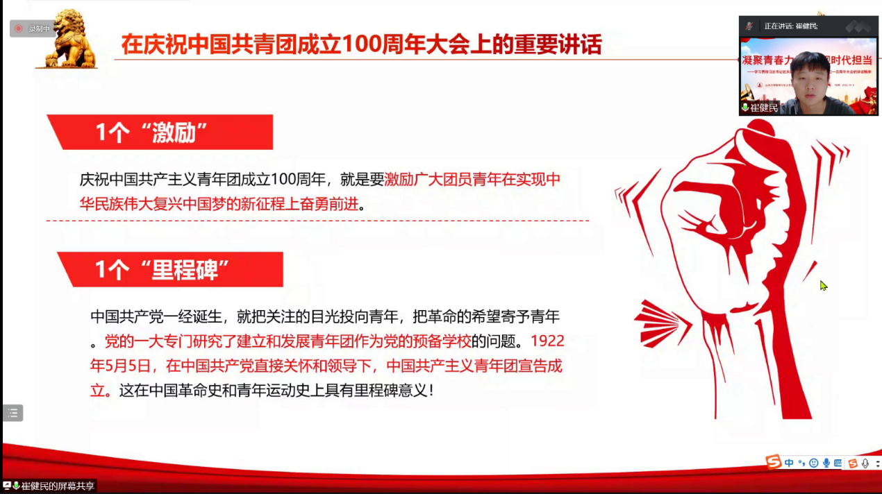 崔健民以《凝聚青春力量,展现青年担当——学习贯彻习近平总书记在庆祝中国共产主义青年团成立一百周年大会的讲话精神》为题作宣讲,带领大家认真学习了习近平总书记在大会上的讲话精神,并重点回顾了习近平总书记对青年给予的期望和要求。