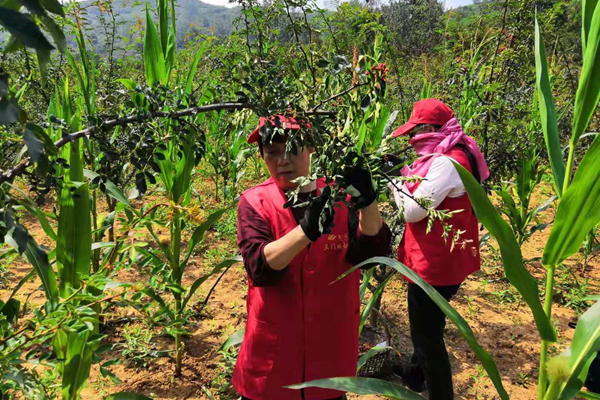 图为志愿者采摘花椒