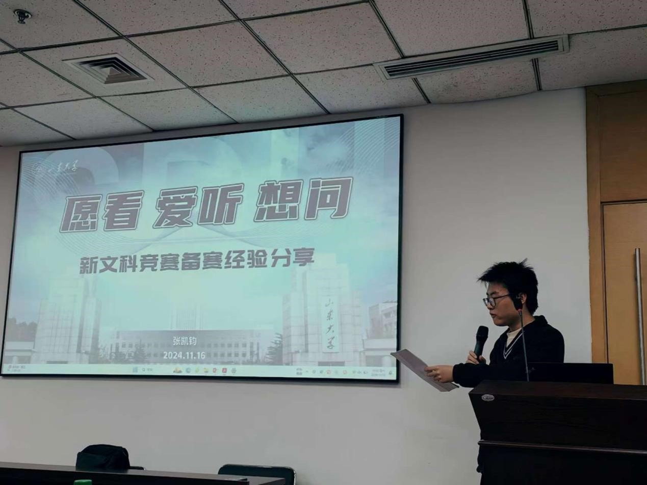 分享会特邀马克思主义学院2021级本科生张凯钧作为主讲嘉宾。他以“愿看、爱听、想问:新文科竞赛备赛经验分享”为主题,深入剖析了新文科竞赛备赛过程中的关键要素与注意事项。张凯钧以“节骺新生:开辟恒久关节假体高效定制新纪元”等优秀项目为例,详细阐述了团队构建、项目成效展示及案例分析等核心内容。