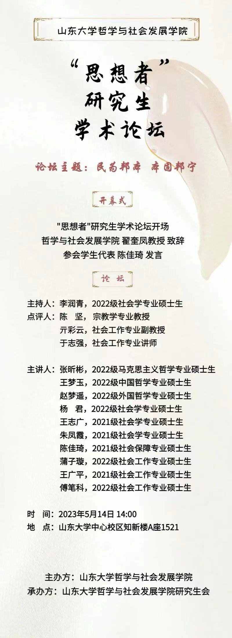 为扩展学术交流平台,进一步发挥《思想者》杂志品牌效应,促进更多学子交流分享,互助共学,学院打造了一系列“思想者”研究生学术系列论坛活动。论坛对应每期《思想者》杂志主题,邀请每期优秀论文作者在论坛分享自己的学术成果。学院以第36、37期《思想者》杂志为基础,开展了“不染污浊泥淖,出世胸怀天下”、“民为邦本,本固邦宁”两次研究生学术论坛。面对面的论坛分享,能够有效发挥学术交流功能,促使更多学子将纸面内容融入到更加深刻的思考中,彼此启发、互相学习,培养深度科研的能力。