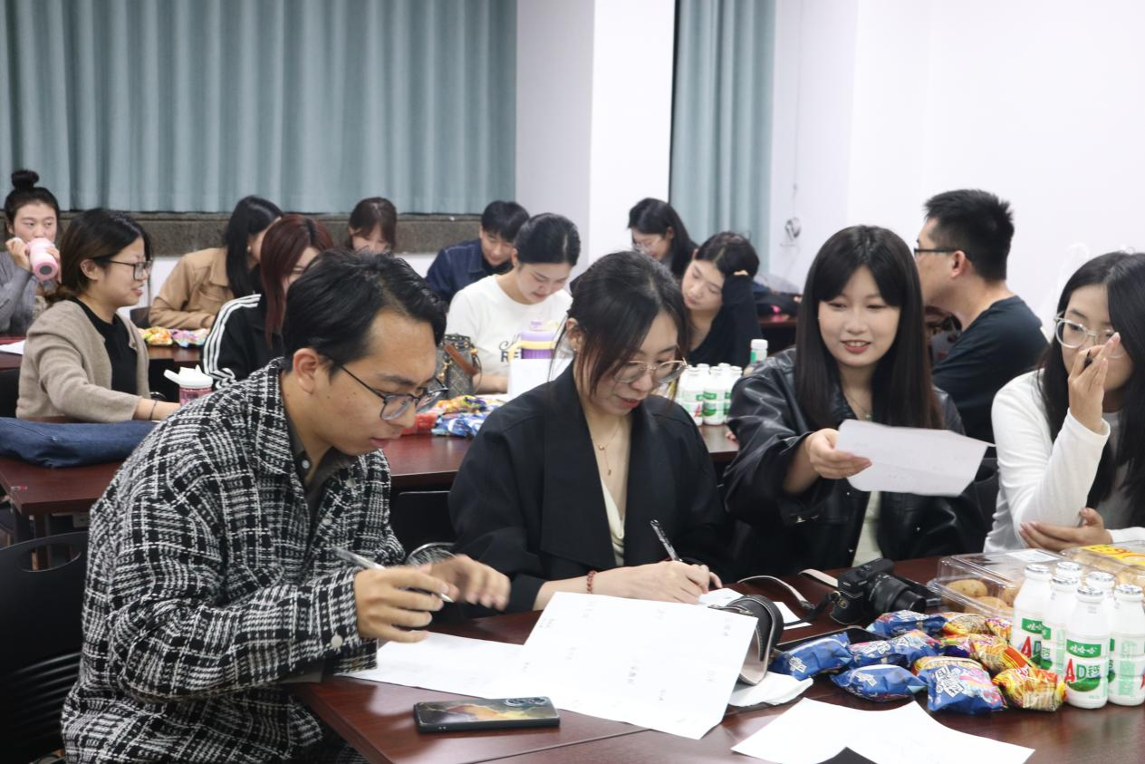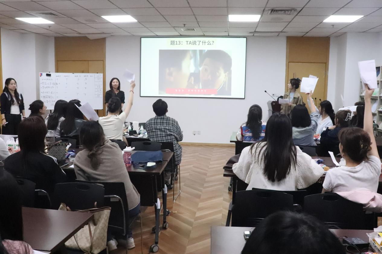 随后,同学们迎来了正式的游戏环节,大家积极参与,纷纷跃跃欲试努力为团队赢得加分。在“重音挑战”中,参赛同学通过对不同字的重读变换情绪,引起场上一阵欢声笑语;在“加字不NG”中,同学们在激动又紧张的氛围中进行记忆和逻辑比拼;在“看图猜台词”环节,大家争分夺秒,踊跃抢答,活动气氛再次到达高潮。在一场场趣味游戏中,研会各部门成员获得了欢乐,收获了友谊;增进了彼此之间的了解,培养了相互之间的默契。