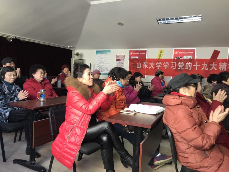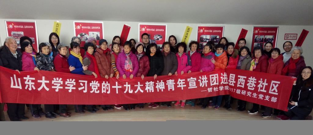 2017级硕士党支部联合济南市基爱社会工作服务中心县西巷社区社工站举办,主题为有关党的十九大新内涵新要求的宣讲,地点设在济南市大明湖街道县西巷社区居委会三楼活动中心。集中宣讲活动,持续了一个上午,取得了良好的理论宣传效果。