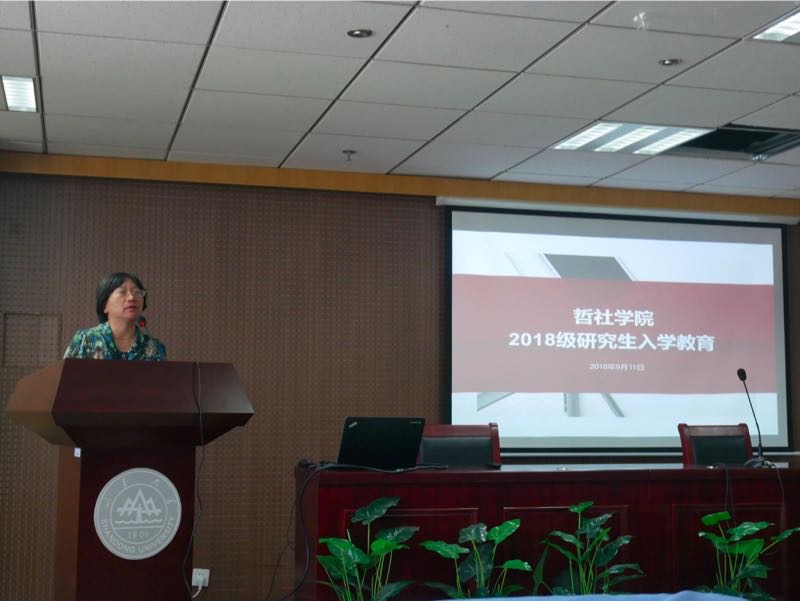 毛永强首先对2018级研究生的到来表示热烈的欢迎。他表示,研究生相对于本科阶段在学术和生活方面都有了更高的要求,对于同学们是一种压力,也更是一种动力。作为研究生新生,同学们应着眼敦品立学,沉潜学术、综合发展,明确个人发展规划和路径。他强调了“立业先立人”的重要性,希望同学们锤炼品格,与人为善,恪守学术道德和社会公德。毛永强还结合近日的社会热点问题,叮嘱各位同学注意个人的财产和人身安全,提高防范能力。陶莉从研究生生育管理规章制度和图书资料室的使用两方面进行了介绍。她首先向新生说明了研究生在读期间的生育制度,并强调了遵守规章制度的重要性。其次,她讲解了哲社图书资料室的馆藏、图书借阅和图书采购方法,并鼓励研究生同学在新学期能够多读书,提高学识,学院也会为同学们的阅读需求提供更高质量的服务。赵莹向新生同学详细讲解了研究生教学管理和培养的相关规定与政策,并就学生关心的培养计划制定、学分修读和前沿讲座等问题进行了细致的介绍和讲解。最后,姚蕊为同学们介绍了学校奖助勤贷的相关政策,并强调了学院日常管理的相关规定以及入学教育期间的活动安排情况。