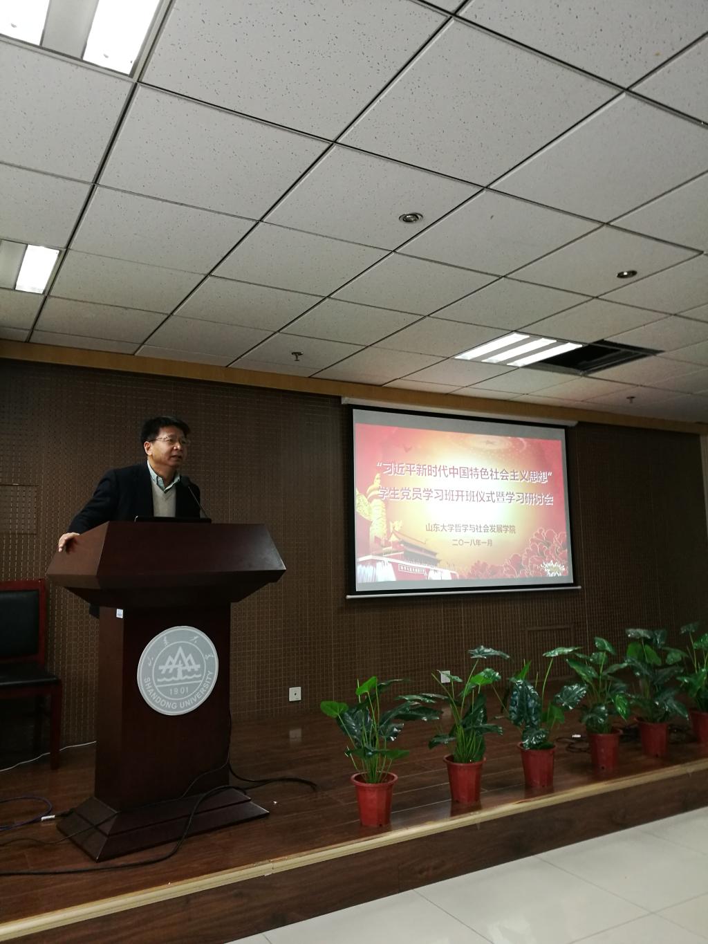 1月6日,H视频 习近平新时代中国特色社会主义思想学生党员学习班开班仪式暨学习研讨会在知新楼举行。H视频 院长刘杰、党委书记杨斌出席会议并讲话,院党委副书记阚铮、教师代表、全体学生党员参加开班仪式,院党委副书记毛永强主持开班仪式。